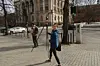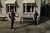 Jakob B. Cyvin (t.v.) og Jardar Cyvin (t.h.) på mobil kontorløsning streamer live fra Trondheim sentrum der det er 400millioner år gamle fossiler i veggen i bakgrunnen.Foto: Marcela Tesarova.