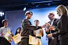 Vinner av Abelkonkurransen 2025/2026 er Skomantas Urbonas fra Oslo International School. Her mottar han diplom og glassvase fra NTNU-rektor Tor Grande og leder ved Matematikksenteret, Kjersti Wæge.