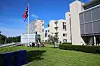 Campus Ålesund er pyntet for anledningen, med vaiende flagg og blomster foran inngangene.