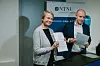 Her signerer Siri Forsmo og Øyvind Bakke samarbeidsavtalen mellom NTNU og Helse Møre og Romsdal. Et stort medieoppbud fikk nyheten med seg.Foto: Else Britt Ervik/NTNU