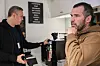 Jonathan Whitlock, til venstre, i ferd med å brygge seg én av dagens tre-fire kaffekopper, mens Paulo Bettencourt Girão forteller om historien bak kaffebønnene som brukes i maskinen.Foto: Synne Mæle