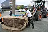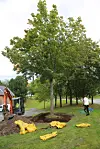 Arborist Robert Stellander Larsen gjør det han kan for å gi treet en god start på sitt nye hjem.Foto: Kamilla Østerberg