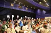Mot slutten av studentenes spørretime med statsråd for forskning- og høyere utdanning under landsmøte i Norsk Studentorganisasjon (NSO) kom delegatene fra NTNU med en stille protest, der de holdt opp bokstaver som dannet ordet «campussamling».