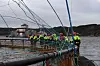 Formidlingen ute på merdene er et samarbeid mellom Kystmuseet og Lerøy, hvor det gis mulighet til å ta med besøkende gjennom produksjonskjeden. Det var ikke store fisken i Lerøys merder når sudentene var på besøk, men små spretne fisk på rundt 300g.Foto: Kamilla Østerberg
