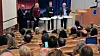 Gunnar Bovim, Webjørn Rekdalsbekken, Helge Klungland og Jørn Wroldsen møter de ansatte ved Høgskolen i Gjøvik for første gang.Tore Oksholen
