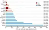 Figur 1 – Gjennomsnittlig årlig økning elektrisitetsproduksjon uten klimagassutslipp pro capita gjennom et tiår med oppskalering.Kilde: Cao J. et al. (2016). China-U.S. cooperation to advance nuclear power. Science, 353 (6299). DOI: 10.1126/science.aaf7131.