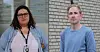 Kvinne med blondt hår, svart skjorte og briller i samtale med en person vi kun ser bakfra.