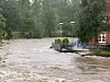 Ekstremværet «Hans» har ført til stor vannføring i Hunnselva. Bildet viser terassen utenfor kantina på Mustad Næringspark. NTNUs eksamenslokaler er lengre inn i parken, og i plan fire og fem.Foto: Kai Robert Jakobsen