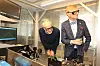 Øyvind Weiby Gregersen og Thomas Tybell besøker laben til Laser Physics Group i Realfagsbygget. Laseren de holder på med her er bare et av eksemplene på forskning NTNU driver med på kvantefeltet.Foto: Benedikt Erikstad Javorovic
