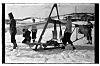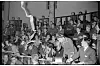 Akefest på hytta den 24. januar 1954, etter kåring av Agedronning. Aktiviteten ser ut som rævkrok, en brytelek mellom to personer hvor målet er å bruke bena til å vippe motstanderen over i en baklengs kollbøtte. Denne leken er fortsatt populær på mange bygder i Norge.Foto: foto.samfundet.no/NTNU Universitetsbiblioteket