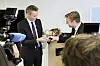 Tre fagstatsråder for UH-sektoren har spilt sentrale roller i sommerens og høstens aksjeføljetong, her representert ved de to siste: Henrik Asheim overleverer nøkkelkortet til sin etterfølger Ola Borten Moe.