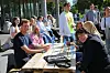 ÅLESUND: De nye studentene på økonomi og administrasjon spiste lunsj ute i sola. Lasse Jørgensen (helt til høyre) flyttet hit fra Trondheim for noen dager siden, og har storkost seg siden han kom til Ålesund. - Jeg ville bort fra Trondheim, og ville ikke studere i Bergen eller Oslo. Ålesund er en fin by, og det er mye mer fjell her. Jeg er glad i å gå på tur, så det er jo fantastisk, sier han.Foto: Kaia Sørland