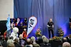 ÅLESUND: Leder for Ålesund studentsamfunn, Ingrid Skodjevåg, holdt sin tale iført klatresele. Egentlig skulle hun rappellere ned på scenen, men fikk beskjed tidligere på dagen om at det ikke kunne la seg gjøre av sikkerhetsmessige årsaker. Hun oppfordret alle til å skaffe seg det rosa medlemskortet med en gang.Foto: Kaia Sørland