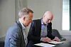 Administrerende direktør i Statsbygg, Harald Nikolaisen, til venstre, og Hans Olav Sørlie, konserndirektør i Veidekke bygg underskriver byggekontrakten om å bygge Delprosjekt P2, Materialteknologi.Foto: Synne Mæle