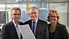 En omfattende søknadsprosess har endt i støtte til 17 nye Sentre for forskningsdrevet innovasjon (SFI). Fra v: Leder for Hovedstyreutvalget og professor på Norges Handelshøyskole, Jarle Møen, administrerende direktør i Forskningsrådet Arvid Hallén og Innovasjonsdirektør i Forskningsrådet Anne Kjersti Fahlvik da de kom ut fra hovedstyreutvalget med listen på de 17 nye SFIene i hånda.