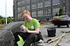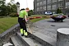 Her plukkar Sunde ugras i trappa opp til hovudbygget på Gløshaugen.Foto: Magnus Vattekar Sandvoll