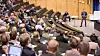 Deltakerne er fordelt på de sju faglige arbeidsgruppene som er nedsatt i forbindelse med fusjonsarbeidet. På grunn av stor tilstrømming har arrangementet blitt flyttet fra Hovedbygningen på Gløshaugen til Auditorium F1 i Realfagbygget. Etter Stensakers foredrag snakket NTNU-professor Kathrine Skretting, som snart tiltrer som ny rektor ved Høgskolen i Lillehammer, om perspektiver og historiske erfaringer med fusjoner.