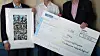Eirik Eik Svanes med sjekken, flankert av rektor Torbjørn Digernes og Rune Haglund fra den prisutdelende stiftelsen.Nil Chr Meland