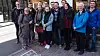 NTNU-STUDENTAR I JAPAN: Her er studentane utanfor den norske kafeen Fuglen i Tokyo. På biletet står Ola Prøis Bergli, Trond Bongard Munkeby, Olav Galteland, Sondre Håbrekke, Ole Skuggevik, Andreas Suorza Sørensen, Joakim Tafjord og Endre Wangen. Sigrid Sløgedal Løvland og Borghild Moe har plassert seg lengst framme. Reiseleiar Anna Ringvold er nummer tre frå høgre på biletet. Ved sida av henne står kjemiprofessor og delegasjonsleiar Bjørn Hafskjold. Lengst til venstre framme står kona hans, Anne- Donia B. Hafskjold.